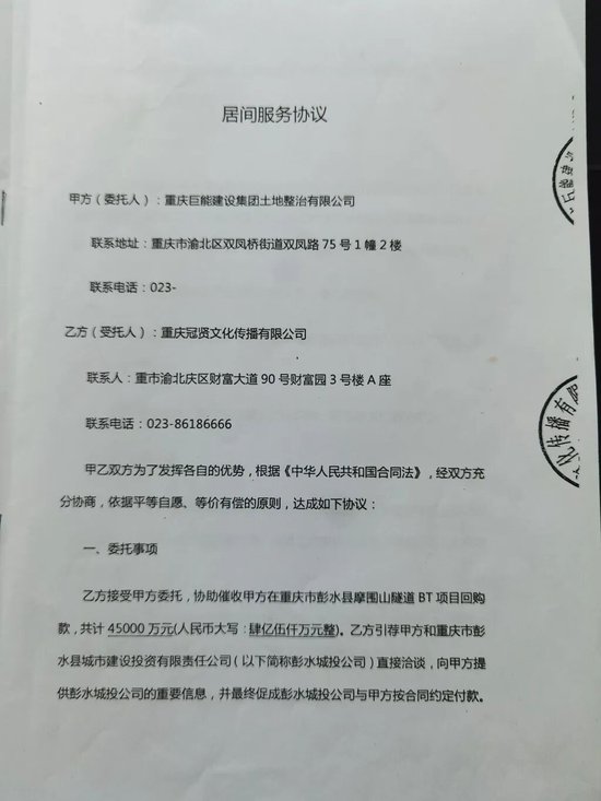 此后,巨能集团旗下公司与赵春建实控的重庆冠贤文化传播有限公司(简称“冠贤文化”)签署《居间服务协议》,载明巨能集团旗下公司委托冠贤文化协助催收4.5亿BT项目回购款,居间服务费以巨能集团实际到账回购款的0.5%计算。